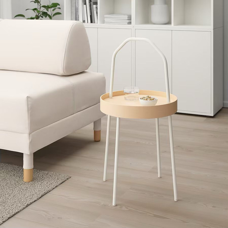 میز کنار مبلی ایکیا مدل BURVIK رنگ سفید میز مبلی ایکیا مدل BURVIK دارای یک طراحی فوق العاده زیبا ، سیال، انعطاف پذیر و فعال می باشد که به واسطه ی دسته ی خود قابل حمی می باشد و شما می توانید آن را در هر کجا که دوست داشتید مثلا کنار مبل ، کنار تخت خواب و بگذارید. دسته ی این جلومبلی ایکیا به شکلی طراحی شده است که هنگامی که آن را حمل می کنید تعادل وسایلی که روی آن قرار دارند حفظ می شود. به لطف ارتفاعی که دسته ی این میز کنار مبلی دارد شما می توانید وسایل بلندی مانند گلدان را روی آن چیدمان کنید. جنس میز به گونه ایی است که همیشه فوق العاده شفاف به نظر می رسد و خیلی دیر لکه می گیرد. در زیر پایه های این میز پلاستیک های برای محکم ایستادن آن در جای خود تعبیه شده است. این میز جلو مبلی ایکیا فقط برای فضای داخلی منزل ساخته شده است . نصب کردن و جمع کردن آن بسیار راحت می باشد به طوری که به آسانی می توانید آن را جمع کنید و بسته بندی نمایید. قسمت سینی میز ایکیا مدل BURVIK دارای لبه هایی است که از افتادن وسایلی که روی آن می چینید جلوگیری می کند. ارتفاع این میز ایکیا با دسته ی آن 78 سانتی متر می باشد. جنس پایه های این میز از فولاد با پوشش رنگ می باشد و قسمت سینی این میز ایکیا ساخته شده از چوب سه لایه می باشد. 3/250