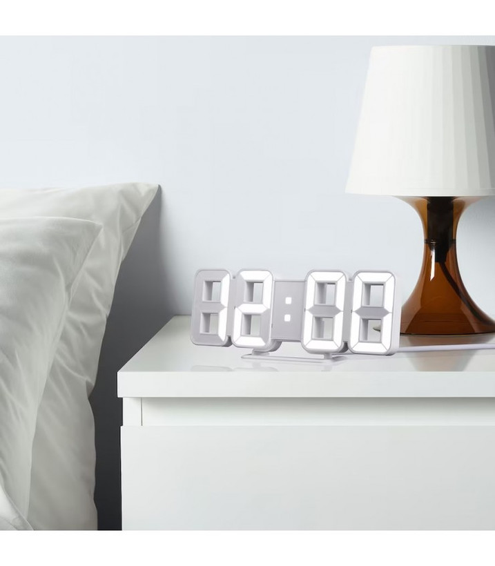 این ساعت رومیزی مدرن ایکیا دارای صفحه نمایش از پلاستیک پلی استایرن و قاب پشتی و پایه از پلاستیک ABS است.