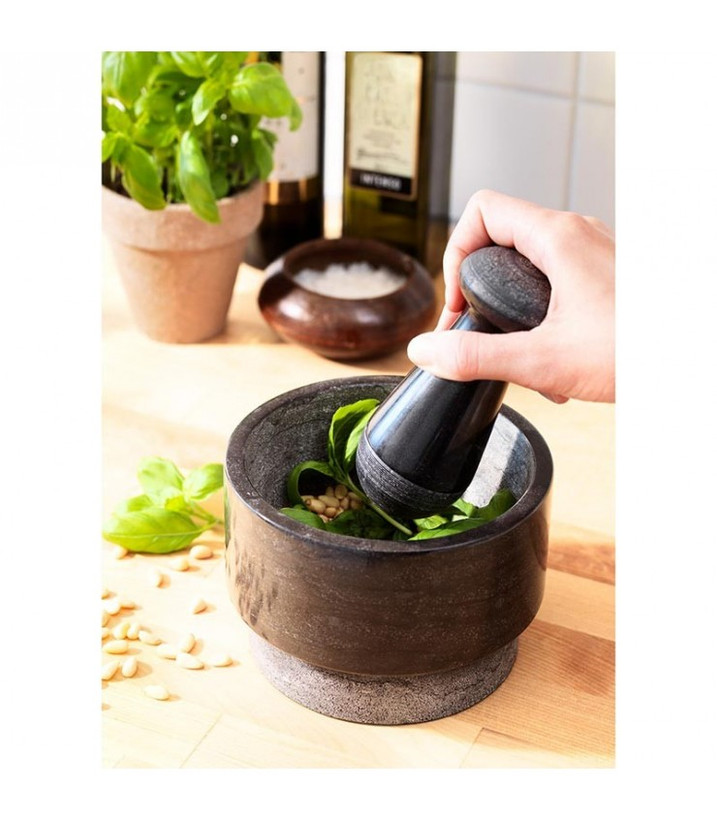 یک هاون خاص از سنگ سیاه مرمر که با آن می توانید مواد مختلف را آسیاب کنید بدون اینکه مواد را کاملا له کنید و کیفیت مواد غذایی را از بین ببرید .