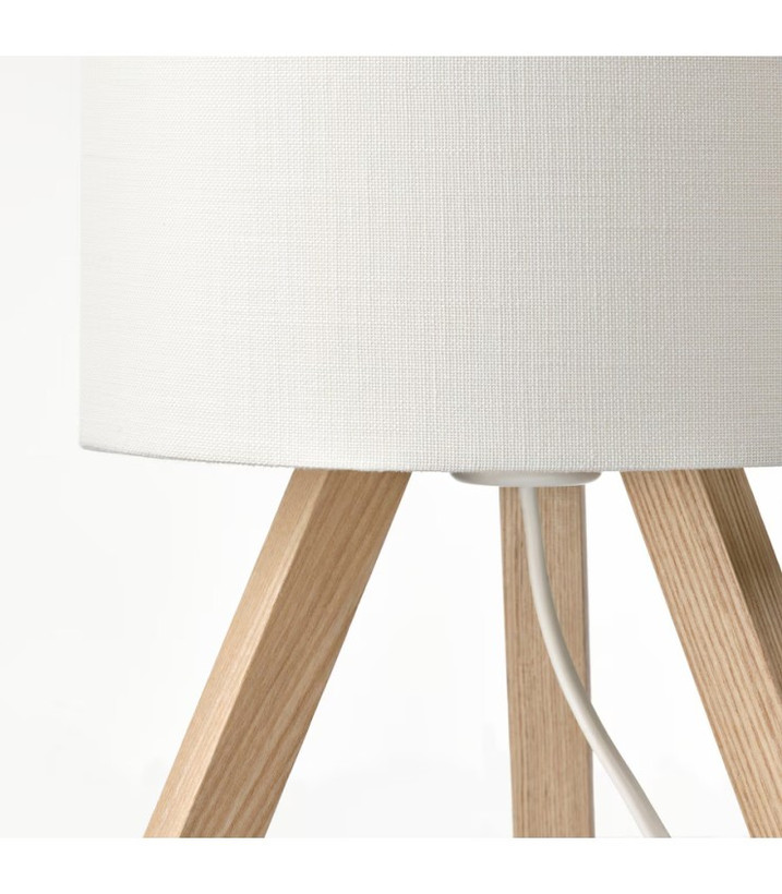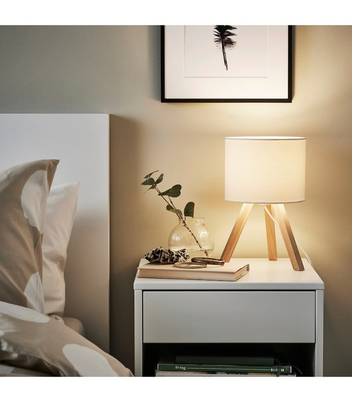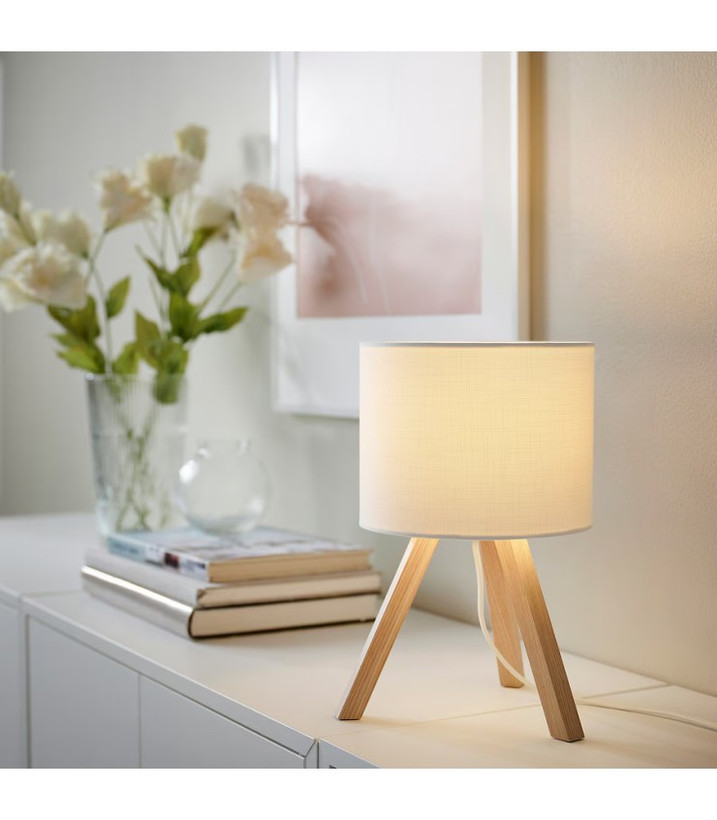 چراغ رومیزی ایکیا مدل STORSEGEL، با پایه چوبی و کلاهک سفید پارچهای، نور ملایم و دلنشینی به فضای شما میبخشد.