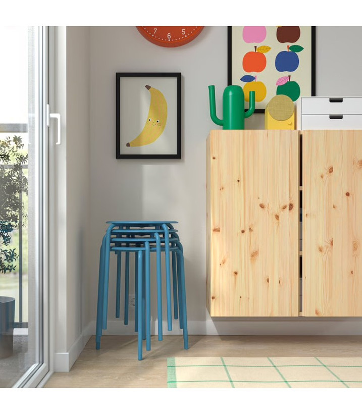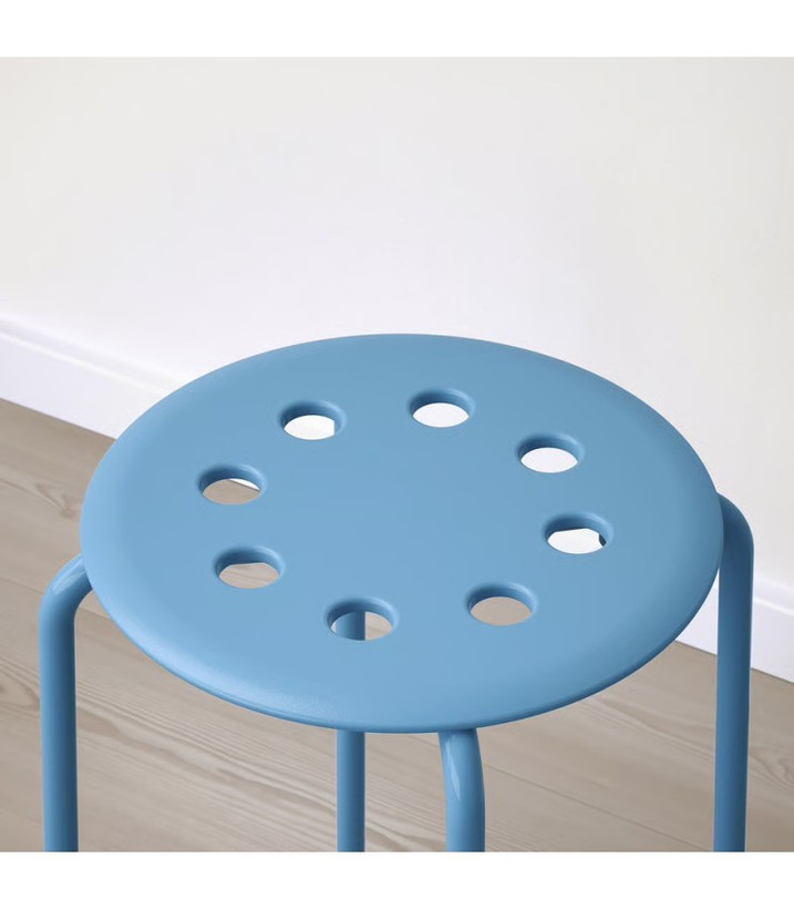چهارپایه ایکیا مدل MARIUS با رنگ آبی و ارتفاع 45 سانتیمتر، سبک، مقاوم، قابل انباشت و مناسب برای آشپزخانه، راهرو یا اتاق خواب. طراحی مدرن و ایمن، تحمل وزن تا 100 کیلوگرم.