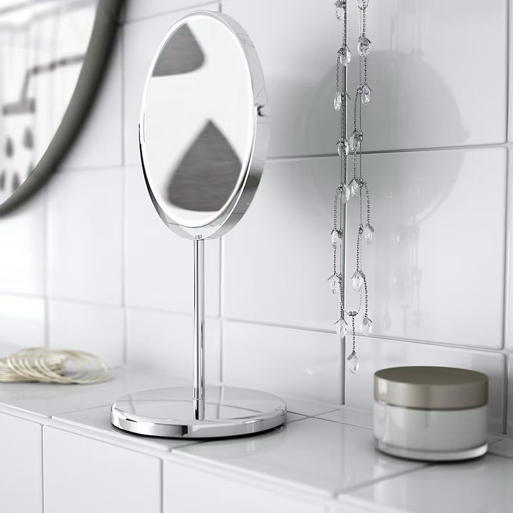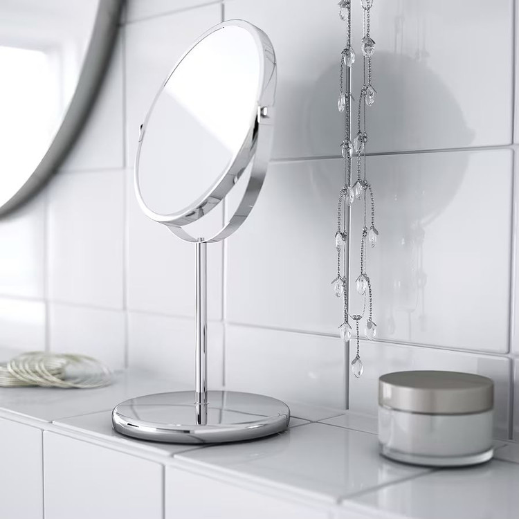 آینه ایکیا مدل TRENSUM جنس پایه و قاب این آینه ایکیا از استنلس استیل ضد زنگ ساخته شده است. قطر آینه ۱۷ سانتی متر می باشد. یک طرف آینه 2.5 برابر بزرگنمایی دارد. برای استفاده در مناطق با رطوبت بالا مناسب است زیرا در برابر آب مقاوم است. تست شده برای استفاده در حمام این آینه 2 طرفه را می توان در هر جایی که نیاز دارید قرار داد. ایده آل برای قرار گیری روی میز آرایش خانم ها یا برای اصلاح آقایان 620